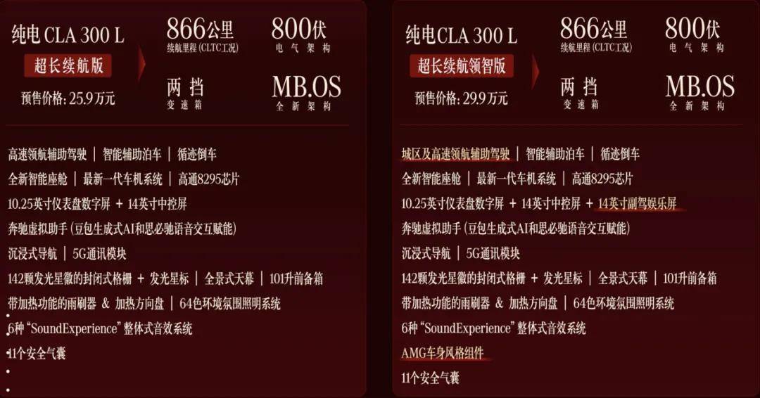 具体来看,奔驰全新纯电CLA共推出两款车型,全系标配866km纯电续航(CLTC工况,下同),超过了特斯拉Model 3、小米SU7,后两者的最长续航均为830km。