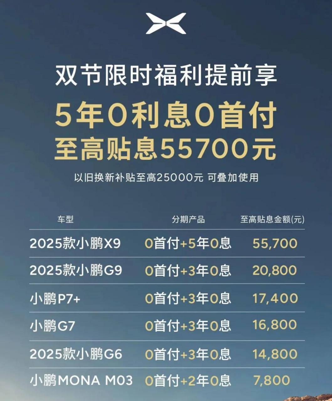 虽然小鹏在9月的成绩创了新高,但这一成绩也可以理解成是小鹏让利而来的。因为在9月初的时候,小鹏就推出了一个力度较大的金融政策:“5年0息0首付和至高贴息55700元”的福利,涵盖旗下全系车型,并且还能和至高25000元的以旧换新补贴叠加使用。换句话说,小鹏的部分车型优惠幅度最高可达8万元。