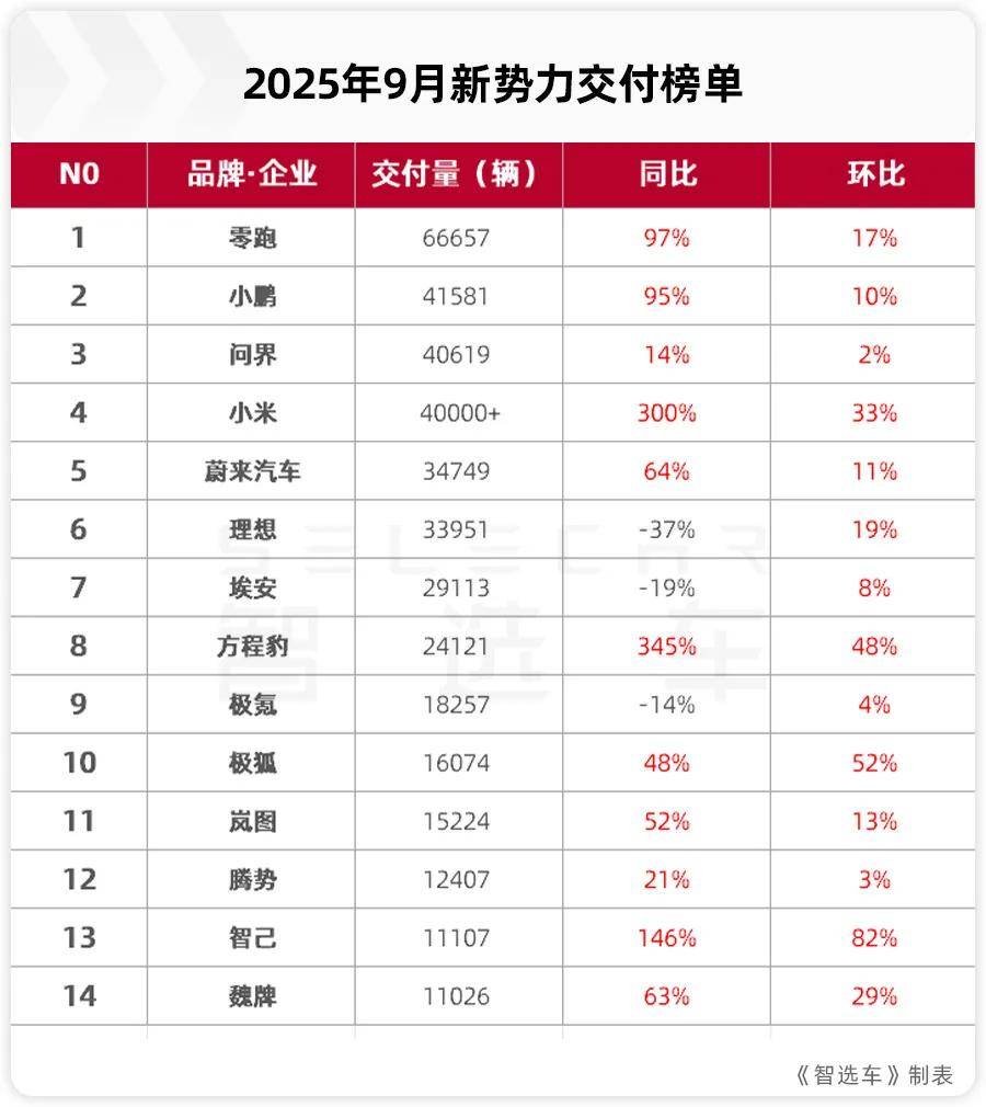 在问界后面的,就是小米,小米已经超过了理想,跻身第四名,9月成绩首次突破4万台,同比增长300%,环比增长33%。