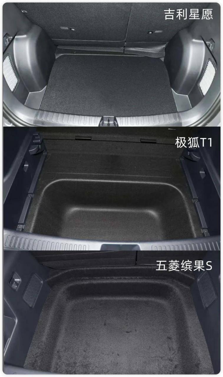 吉利星愿则胜在储物巧思,后排座椅也支持4:6比例放倒,虽然后备箱最大拓展容积1320L,要低于五菱缤果S和极狐T1,但它是同级唯一配备70L前备箱的车型,再加上副驾抽屉、后座下方等分散储物空间,日常放一些零碎物品会比较方便。