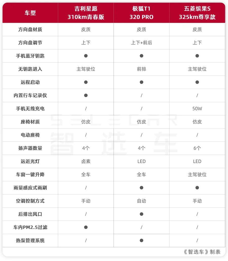 动力方面,极狐T1在低配车型上反而搭载了95kW的大功率电机,五菱缤果S的电机功率中规中矩,吉利星愿的电机功率则最小。