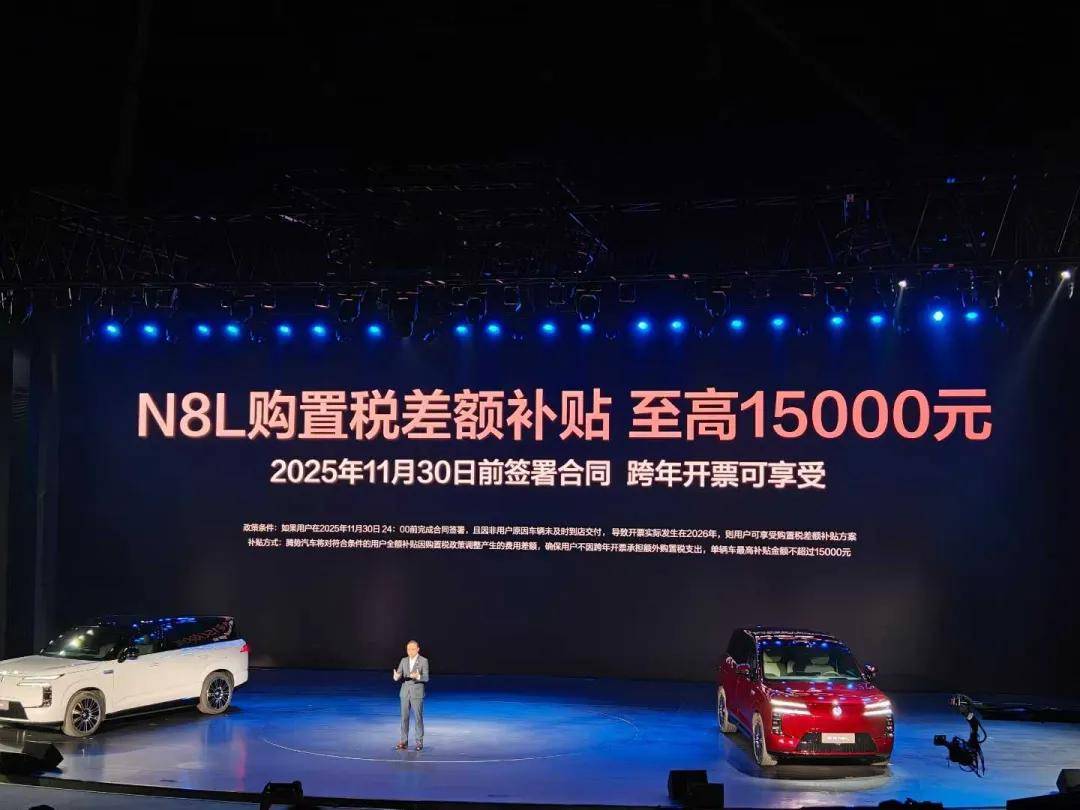 但是腾势N8L提前给大家吃了颗“定心丸”,只要在11月30日24点前完成合同签署的用户,如果因非用户原因车辆未及时交付,导致开票实际发生在2026年的话,腾势提供最高1.5万元的购置税差额补贴。