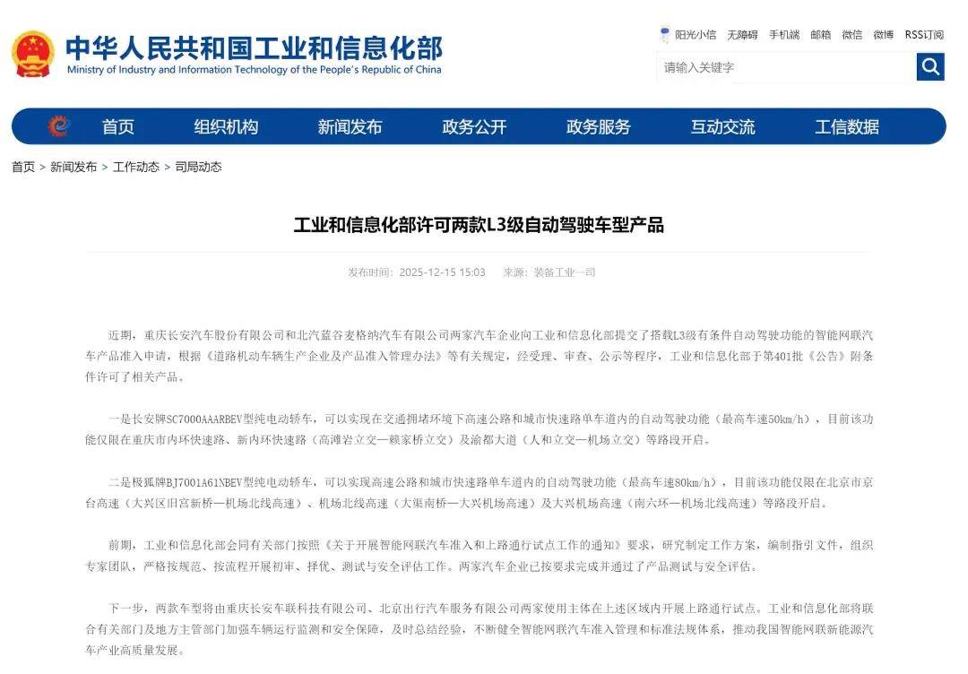 谁能想到,当大家都以为L3级自动驾驶还得等几年才能落地的时候,结果12月15日,还有半个月2025年就要结束了,工信部突然发文公布国内首批L3级有条件自动驾驶车型准入许可,这对于整个汽车行业来说,无疑是一件天大的喜事。
