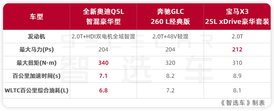 从参数来看,宝马X3虽然发动机功率最大,但峰值扭矩则是全新Q5L有优势,因此百公里加速时间也最快,看来加入了HDI双电机智混系统确实管用,起步时电机可以带来明显助力,油耗也要比奔驰GLC和宝马X3更低。