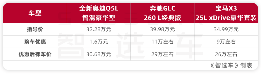 奔驰GLC入门版实际优惠后裸车价在29万左右,落地得32.5万左右。宝马X3入门版现在普遍能有9万左右的优惠,入门版裸车26万左右就能拿下,落地大概29万出头,性价比还不错。