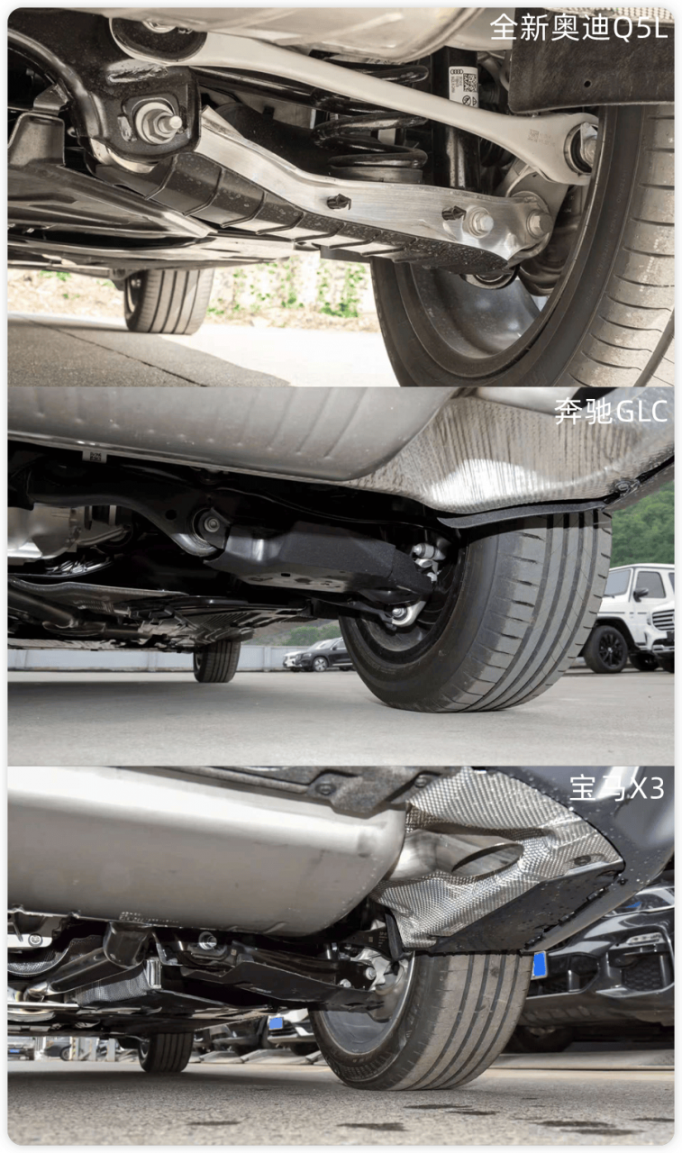 在底盘结构上,全新奥迪Q5L采用了前后五连杆悬架,奔驰GLC是前双叉臂+后五连杆悬架,宝马X3则是前双球节弹簧减振支柱(麦弗逊式的一种变体)+后五连杆悬架。单看结构三款车的后悬架类型一致,主要差异在于前悬架,Q5L最优,GLC次之,X3略逊一筹。